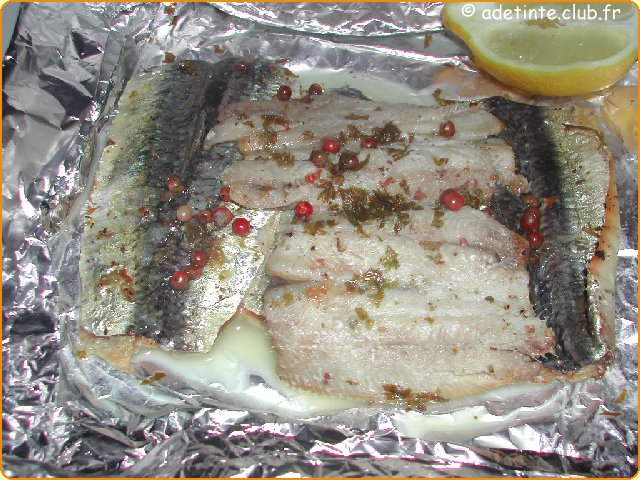 . Prendre des feuilles d'aluminium ménager de 50 cm de long. Côté brillant, pour chaque feuille, parsemer dans la partie centrale 1/4 des herbes ciselées, 1/4 des échalotes hachées, recouvrir avec 8 filets de sardines, saler, poivrer,
